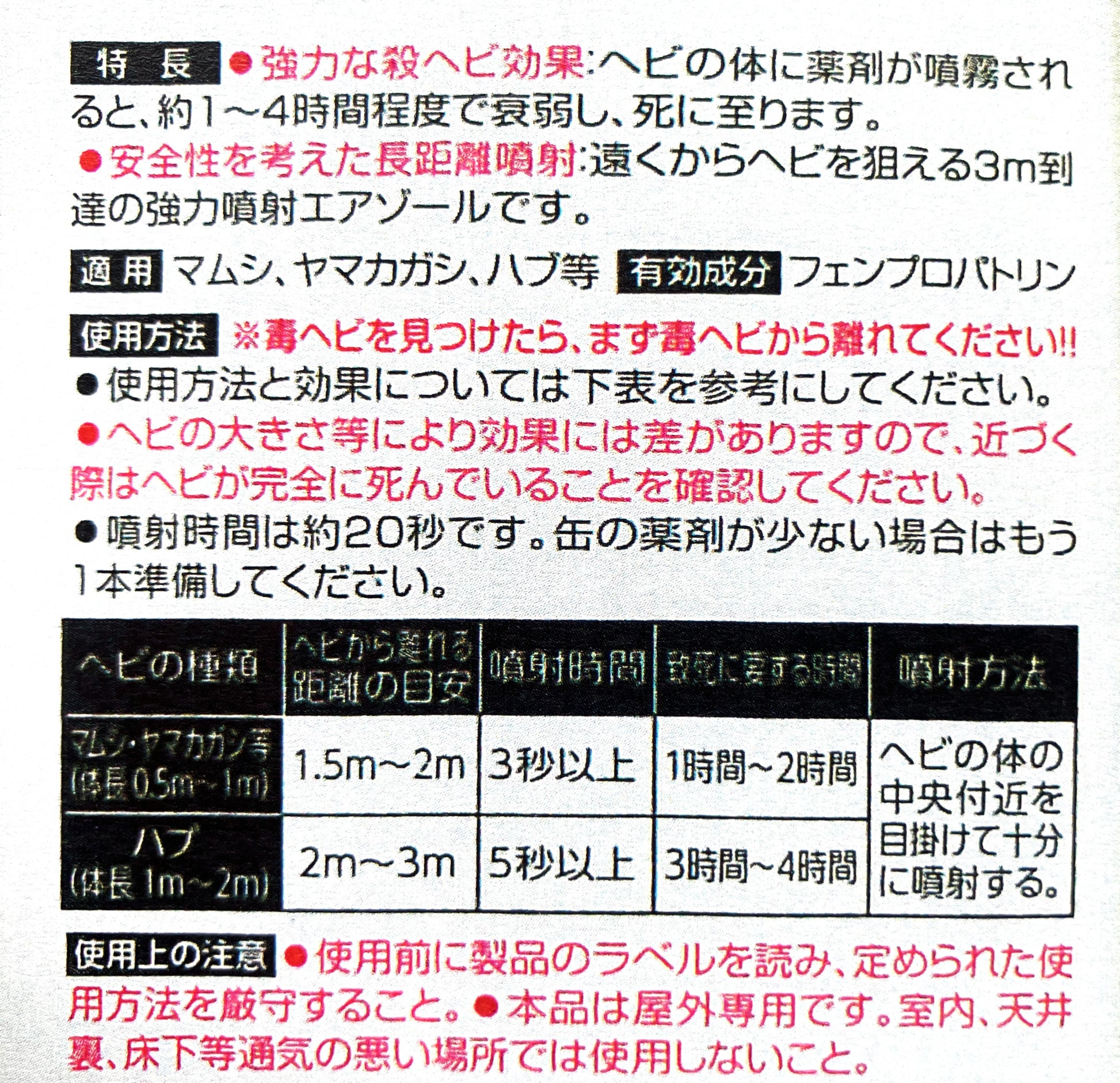 遠くからヘビを狙える3m到達の強力噴射エアゾールです。